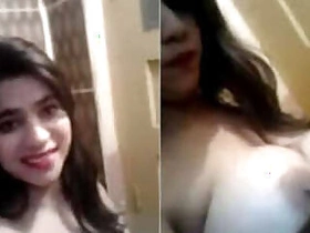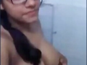 Pretty Desi aunty whips out her natural XXX melons in the bathroom