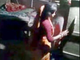 Indian MILF enjoys embroidering with a breast out in homemade porn clip