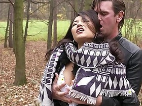 Cum on the face of a pretty girl in public street sex threesome