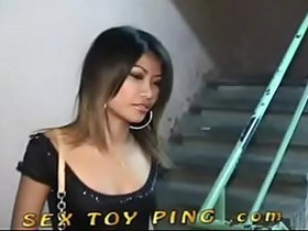 Nasty Asian bimbo with hairy snatch pussy fondled and filled with sex toy